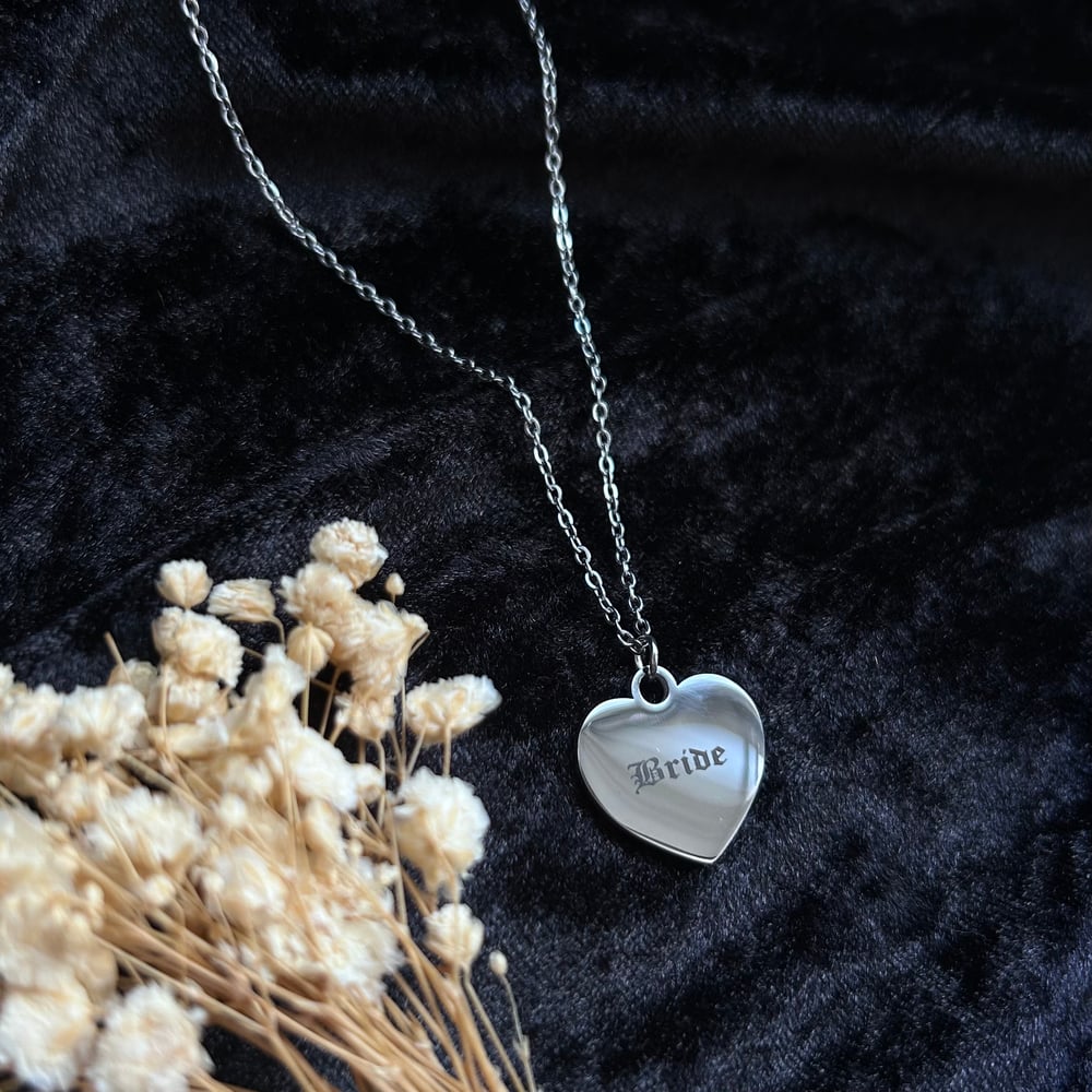 Celebrate your love with our Bride heart shape script necklace. The perfect gift for an alt bride to wear for a Hen party and the big day.