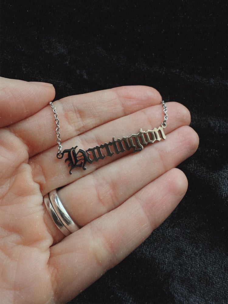 From our Stranger Collection, this unique necklace features the name “Harrington” in an old gothic script.