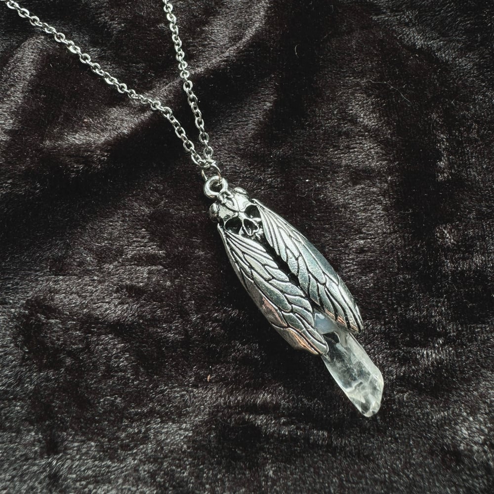 This necklace features a silver moth pendant with a polished clear quartz crystal